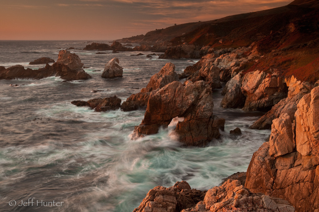 Sunset on a rugged rocky coastline of the Pacific Ocean near Big Sur, California