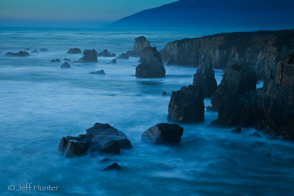A dramatic rugged and rocky coastline at dusk, Big Sur, California