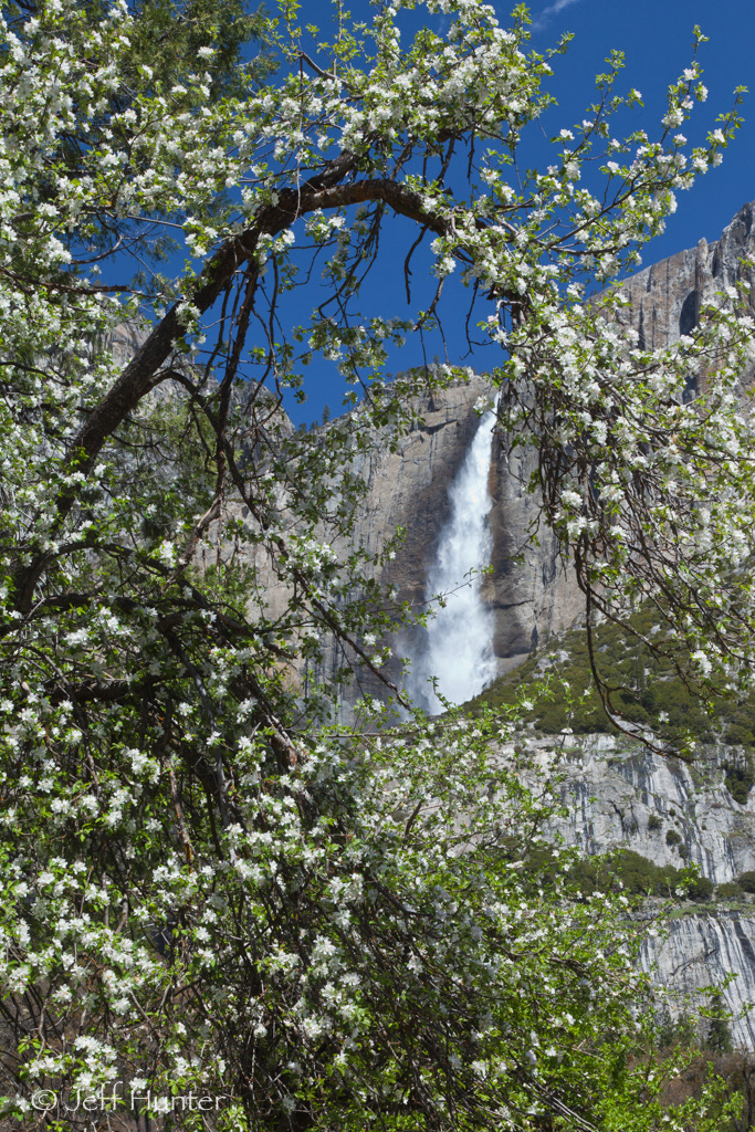 Upper Yosemite Fall framed by an apple tree with blossoms, Yosemite National Park, California