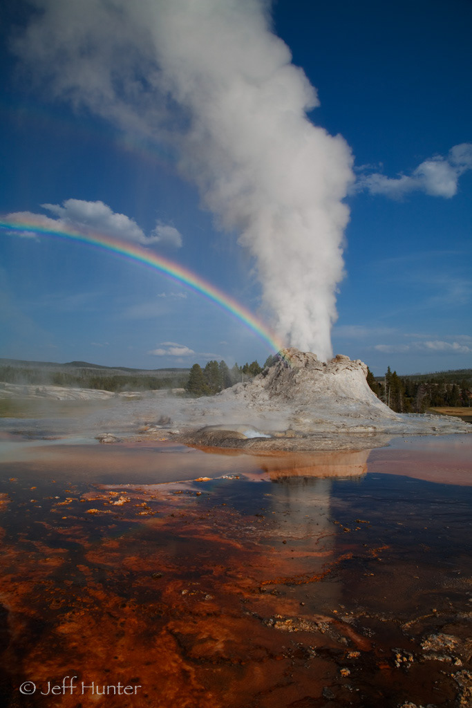 Castle Geyser erupting with a rainbow, Yellowstone National Park, Wyoming
